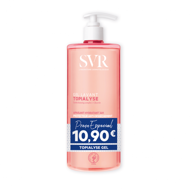 TOPIALYSE GEL LAVANT limpa suavemente e protege a pele contra factores que a deixem seca. A sua fórmula calmante e hidratante de 24 horas reduz o prurido e suaviza a pele para um conforto imediato e duradouro. TOPIALYSE GEL LAVANT respeita a sua pele e o planeta graças à sua fórmula biodegradável1 composta por 89% de ingredientes de origem natural que protegem a barreira cutânea, apenas 10 ingredientes. Testado em pele sensível sob controlo dermatológico, oftalmológico e ginecológico. Sem sabão. pH fisiológico. Hipoalergénico. Embalagem feita de plástico reciclado a 25%.
