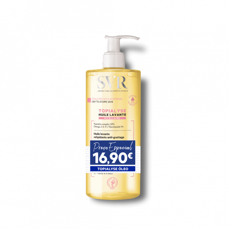 TOPIALYSE HUILE LAVANTE é um cuidado de limpeza eficaz e constitui o primeiro passo na sua rotina de cuidados de pele para acalmar irritações e prurido. Este cuidado luxuoso é rico em lípidos ativos que nutrem e hidratam a pele, mantendo a película protetora contra agressores externos (frio, fricção), assim como evitam que a pele fique seca quando em contato intenso com água. A sua textura sedosa proporciona uma hidratação de 24 horas, para um conforto imediato e duradouro. A pele fica macia e delicadamente perfumada – é o produto favorito de toda a família! Fórmula biodegradável, contém 89% de ingredientes de origem natural. Testado em pele sensível sob controlo dermatológico, pediátrico, oftalmológico e ginecológico. Hipoalergénico. pH fisiológico.