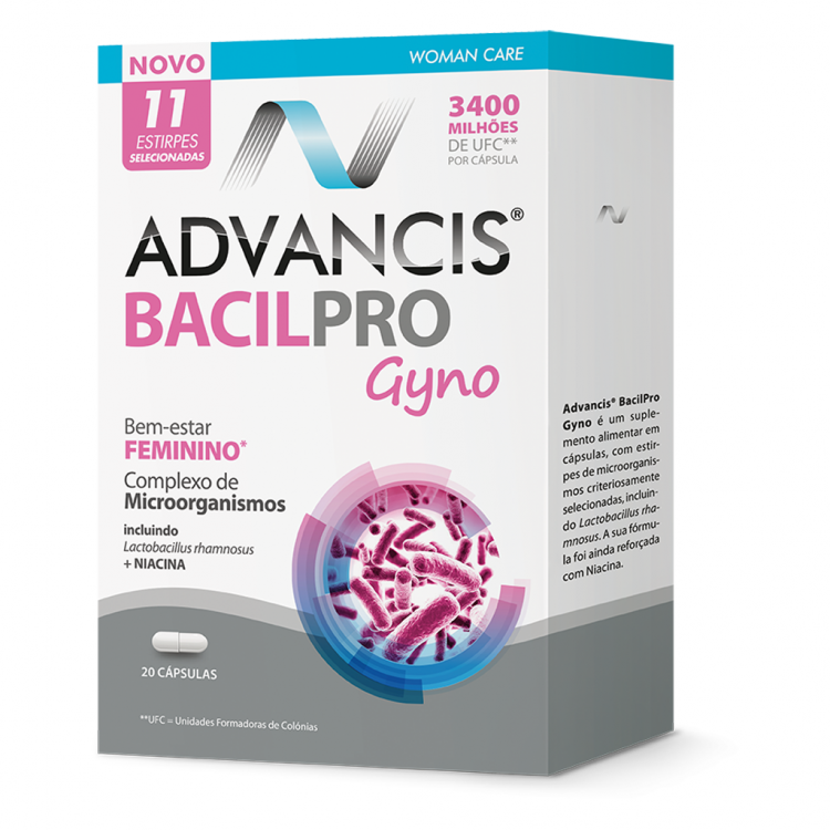 ADVANCIS® BACILPRO GYNO é um suplemento alimentar com um conjunto de estirpes bacterianas que atuam em sinergia na colonização e consequente proteção do aparelho geniturinário. Inclui diferentes estirpes de Lactobacillus sp que representam o principal género de microrganismos protetores do aparelho geniturinário, em particular, o Lactobacillus acidophilus. A mucosa vaginal é naturalmente colonizada por bactérias fundamentais para o seu equilíbrio fisiológico e estas bactérias têm uma importante função protetora, impedindo o desenvolvimento de espécies patogénicas, responsáveis pelas infeções.