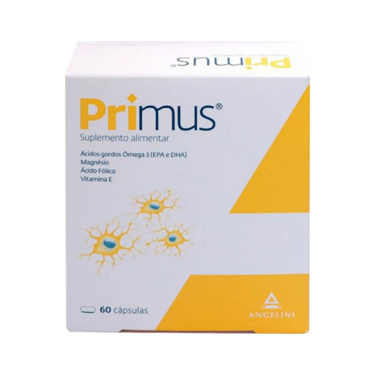 PRIMUS é um suplemento alimentar, sob a forma de cápsulas de gelatina ovais e de cor laranja-escura. Cada cápsula contém uma mistura de óleo de peixe rico em ácidos gordos ómega-3 (DHA e EPA), vitamina E, magnésio e ácido fólico.